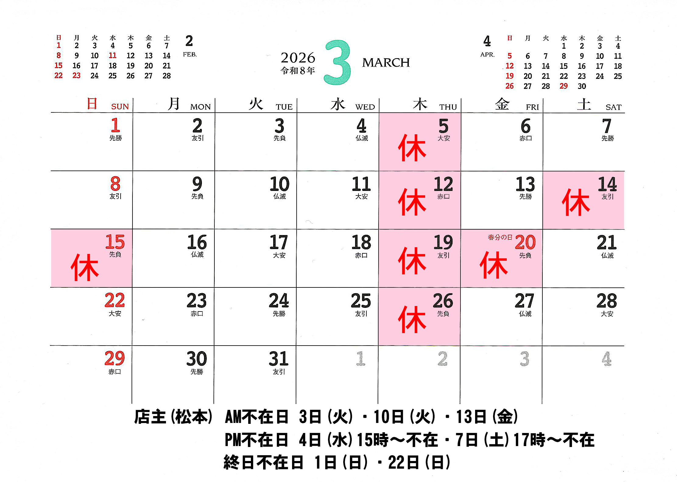 3月の営業予定です。